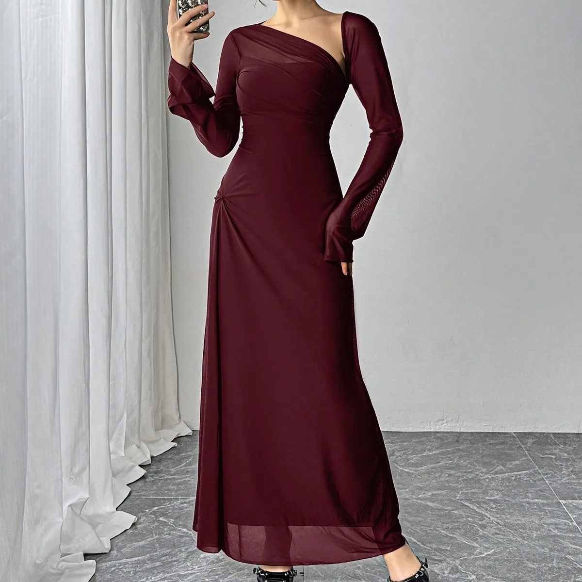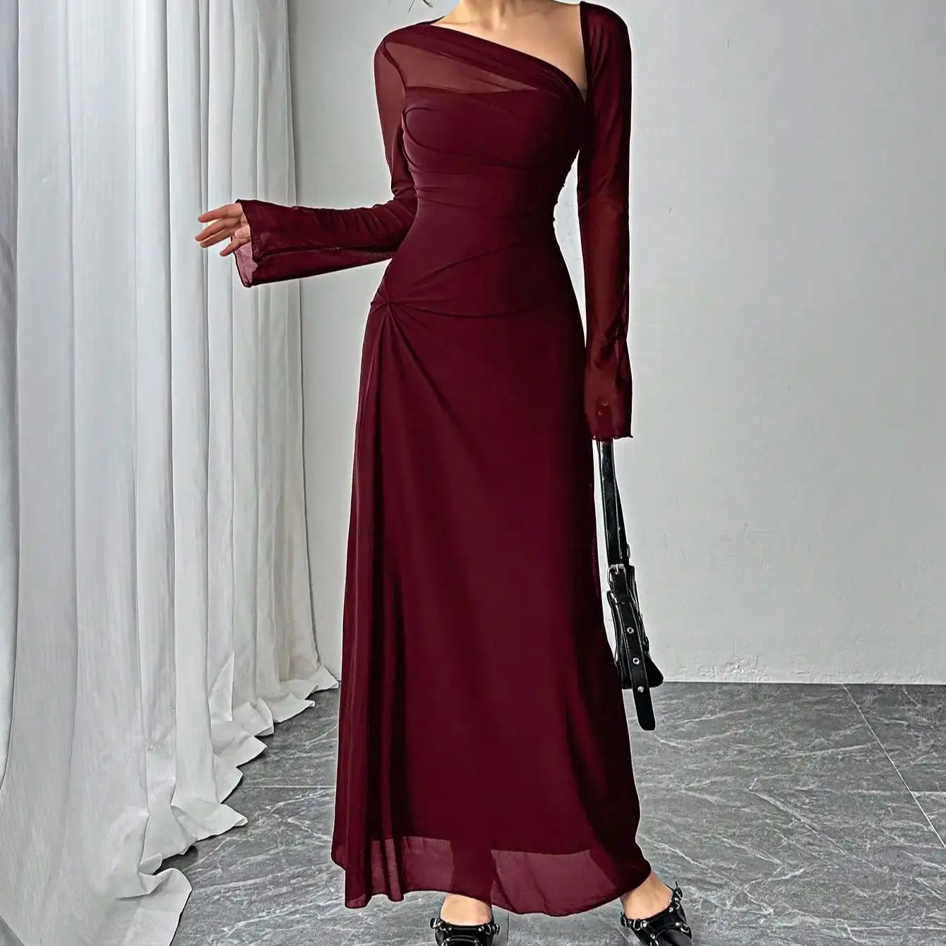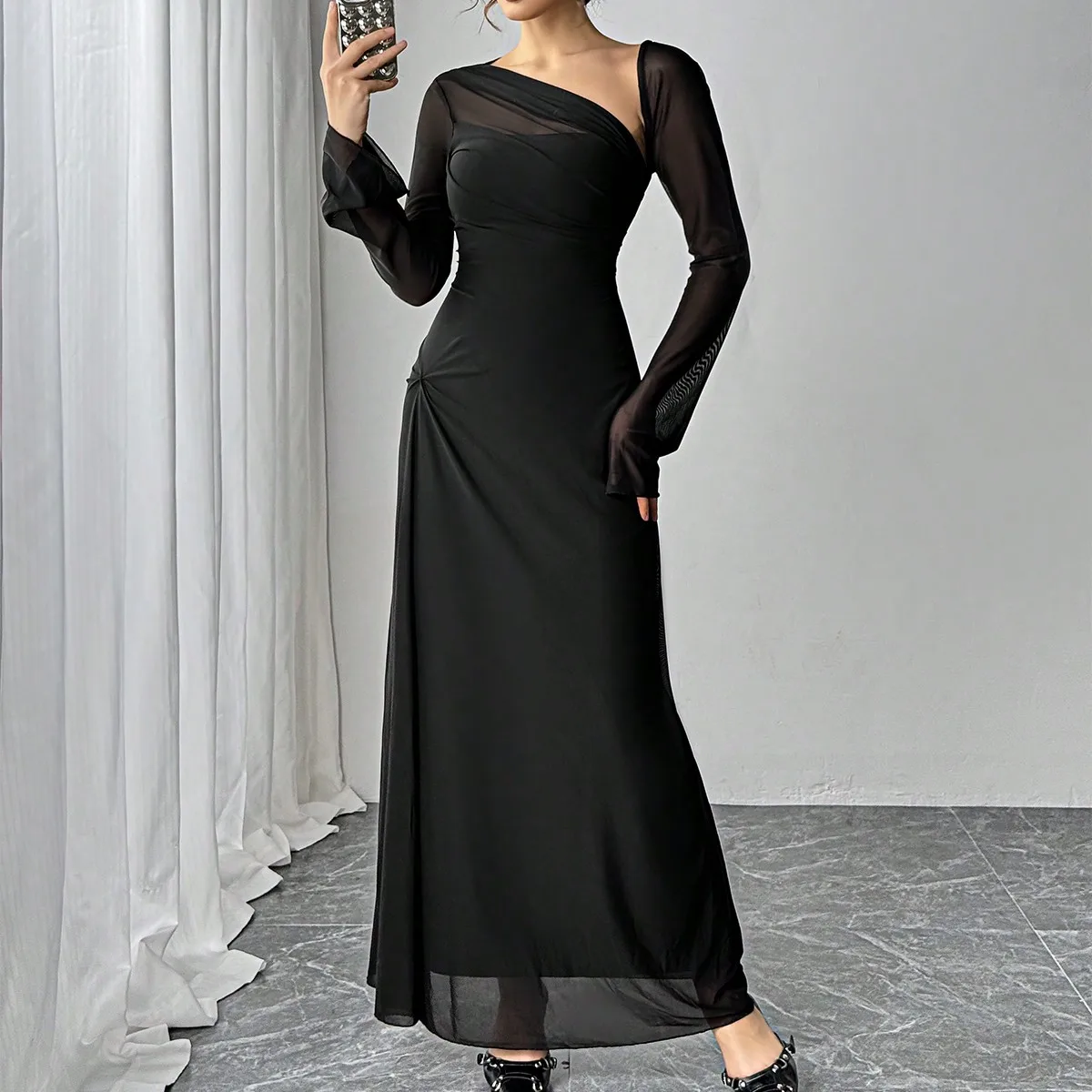 Cross-border 2025 Spring Summer Gauze Explosion Slim-fit High Irregular Oblique Shoulder Ultra Long Dress