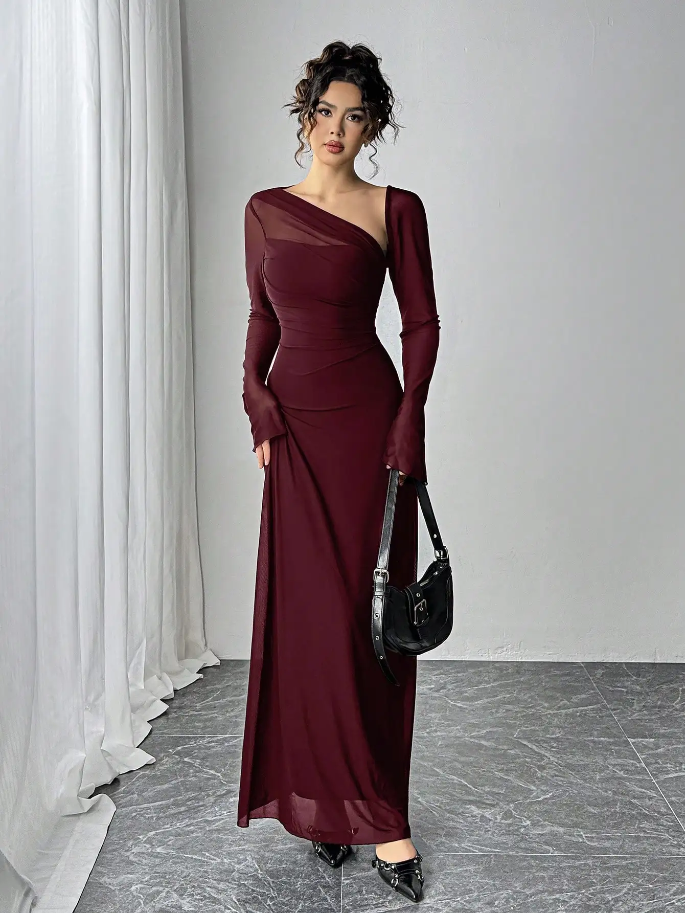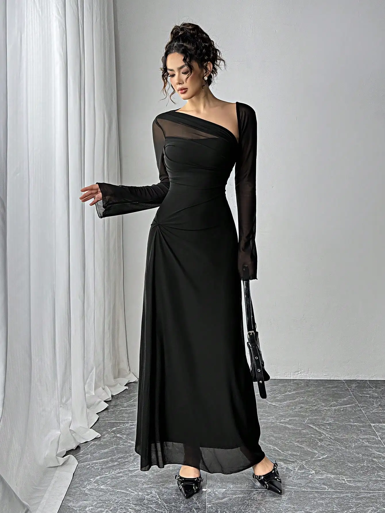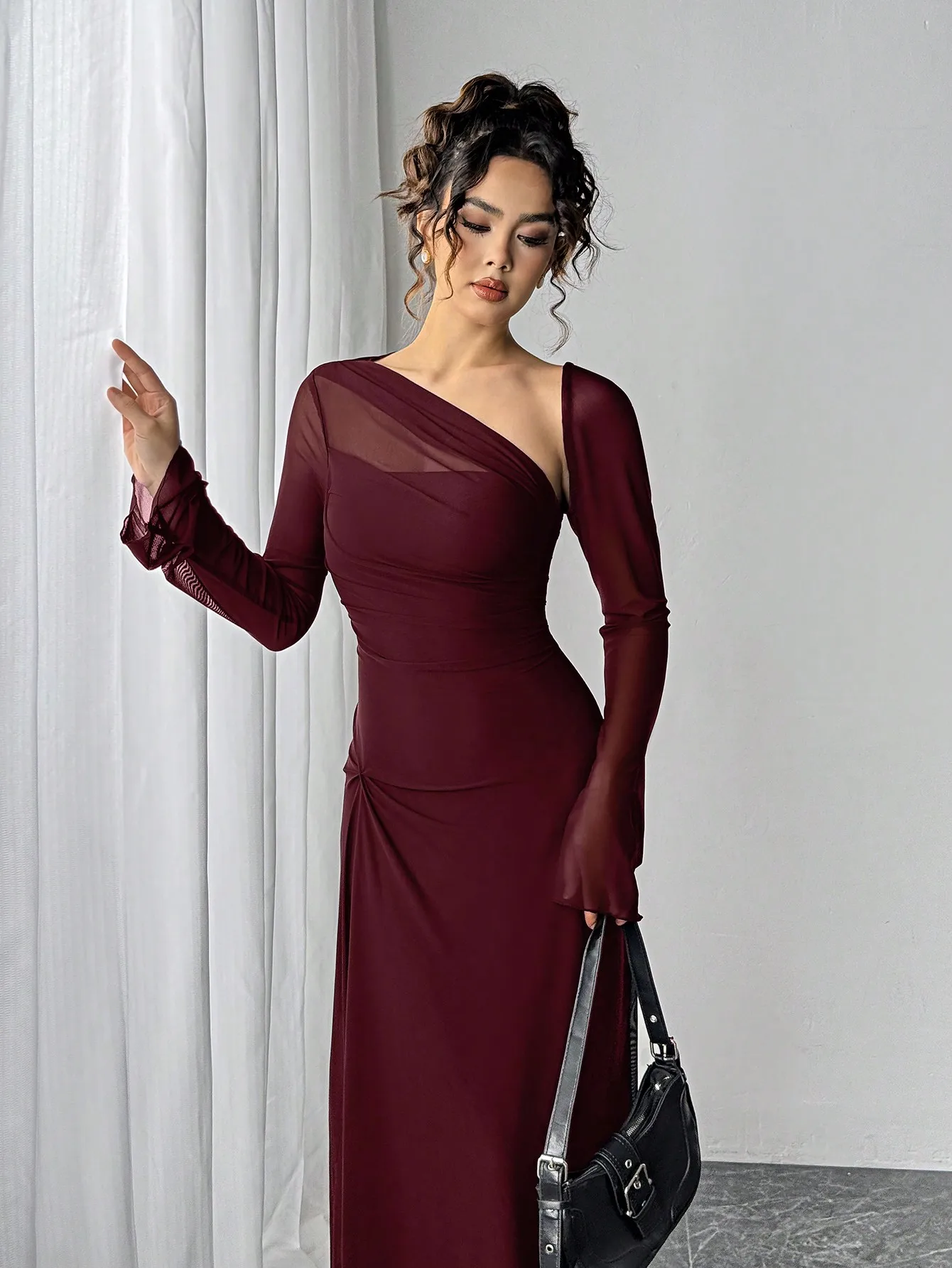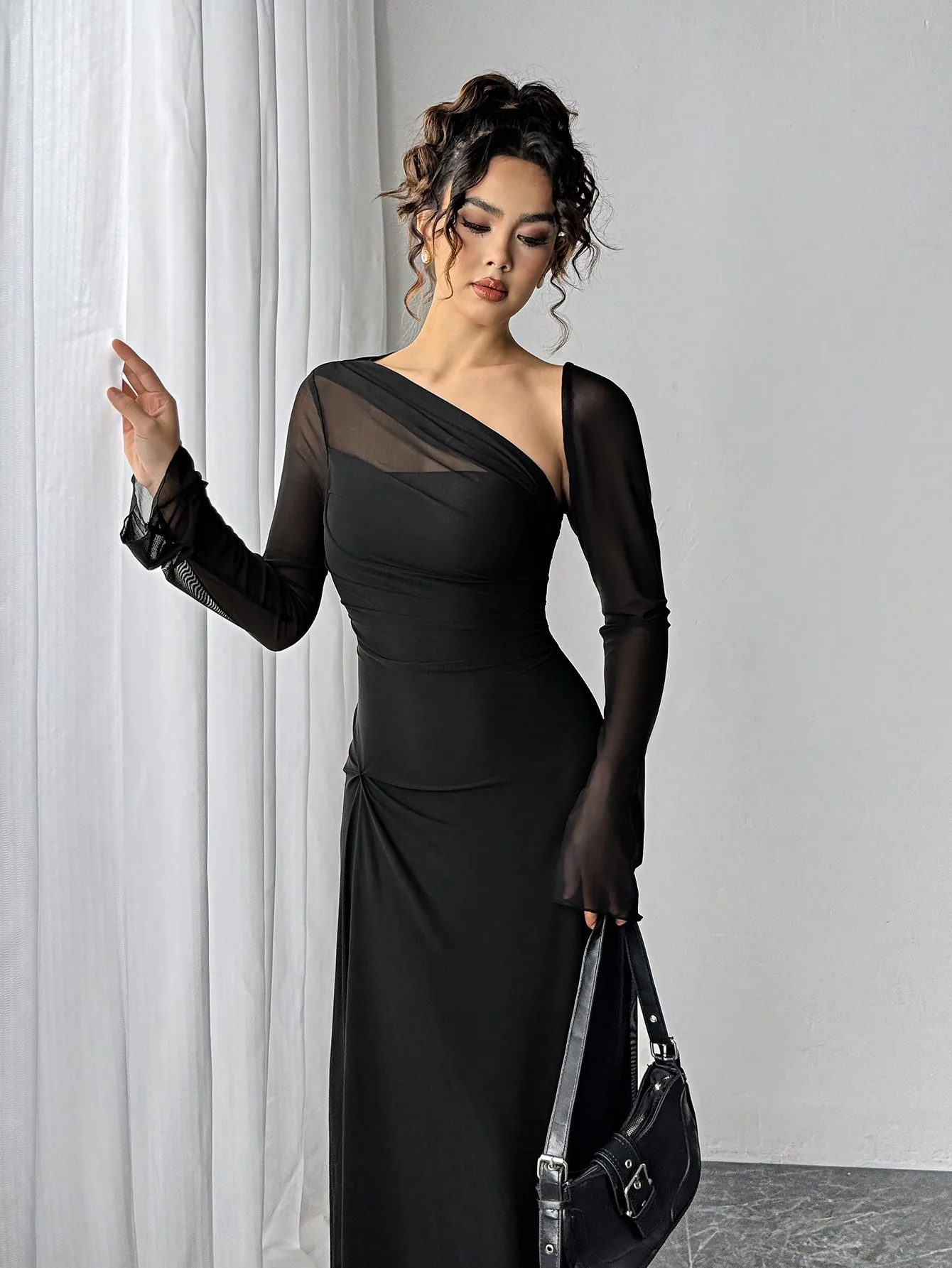 Cross-border 2025 Spring Summer Gauze Explosion Slim-fit High Irregular Oblique Shoulder Ultra Long Dress