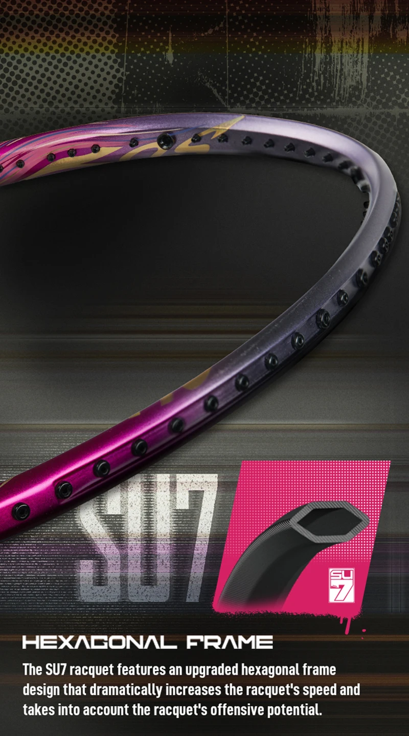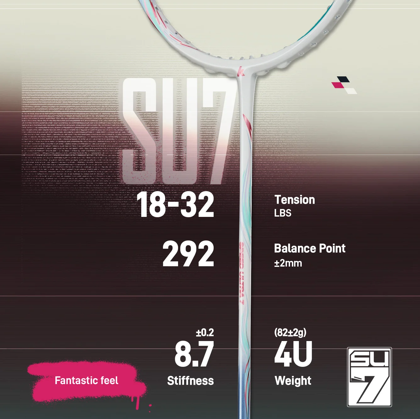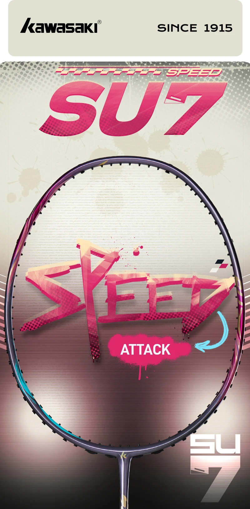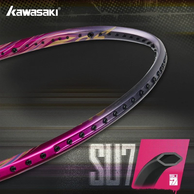 SU7 is Kawasaki 2025's newest full carbon badminton racquet. It is a speedy attacking racket with a weight of 4U and a drawstring tension range of 18-32LBS.