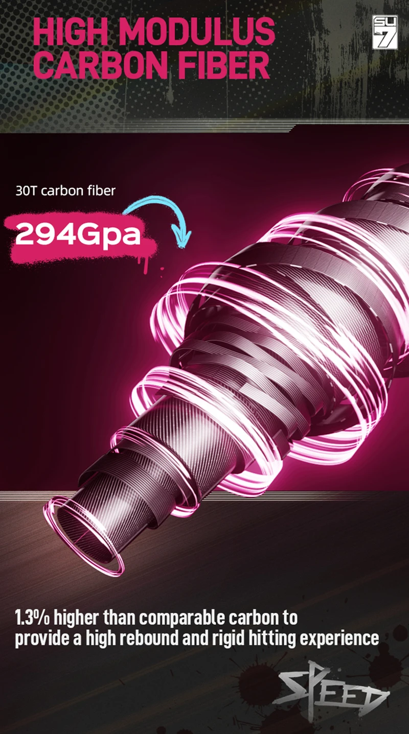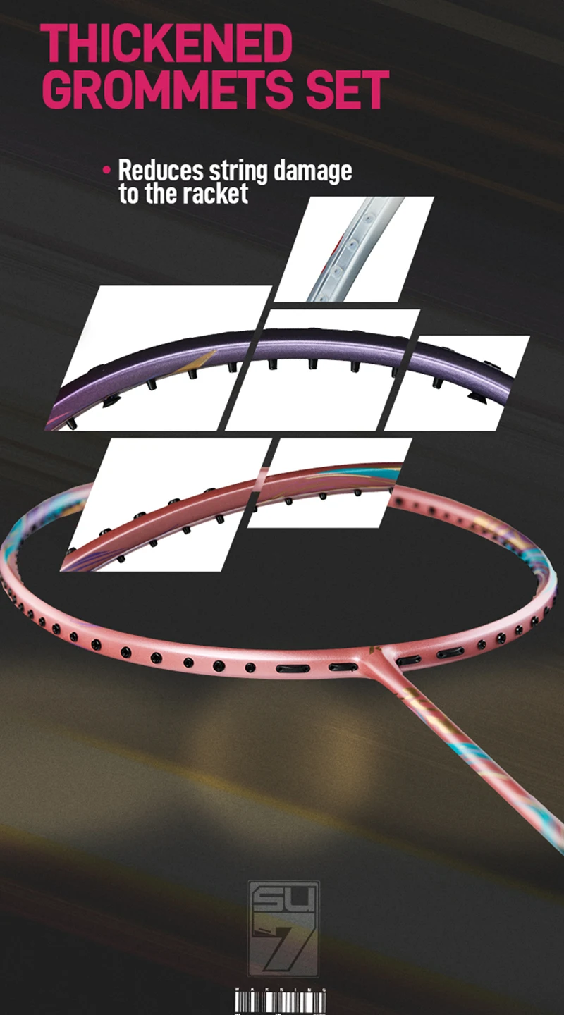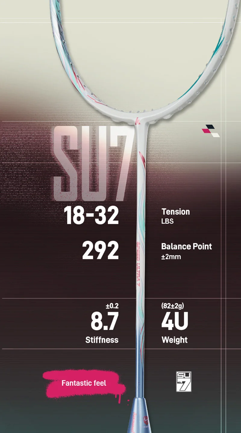 SU7 is Kawasaki 2025's newest full carbon badminton racquet. It is a speedy attacking racket with a weight of 4U and a drawstring tension range of 18-32LBS.