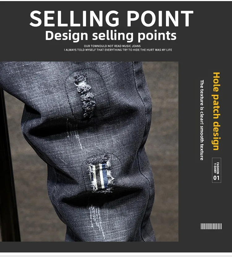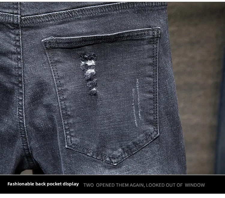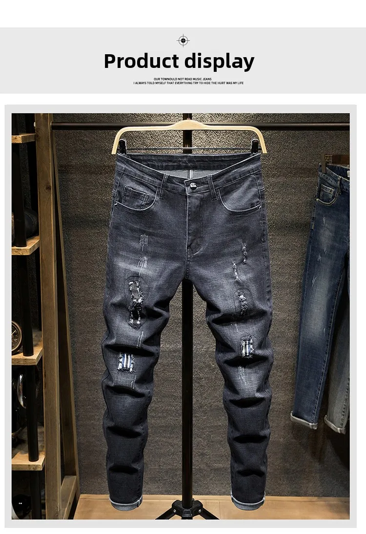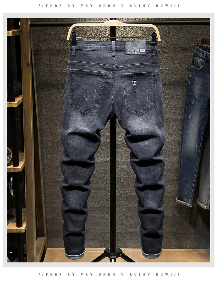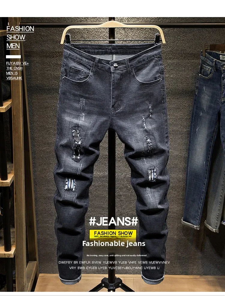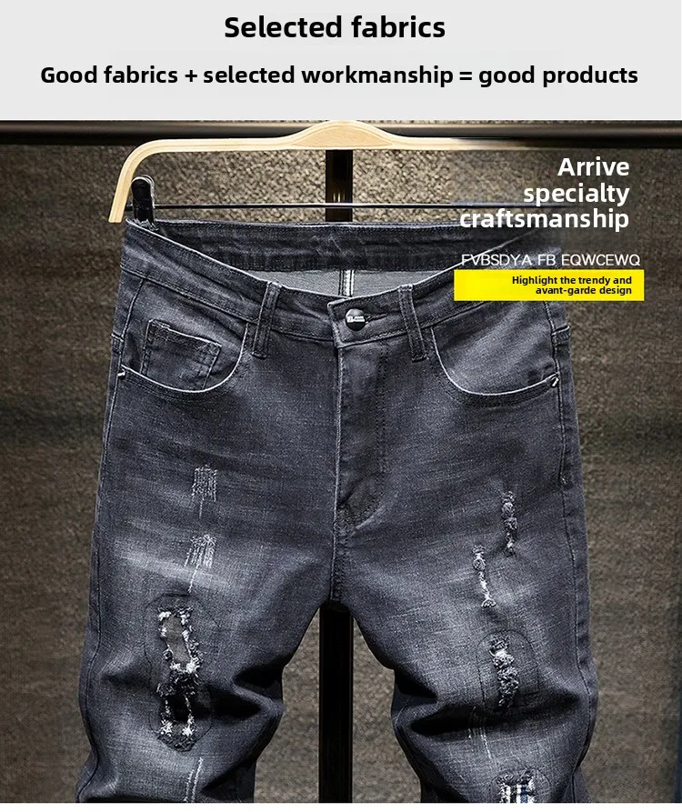 New Men’s Jeans Ripped Fashionable European and American Style Jeans Black Men’s Elastic Comfortable Light Luxury